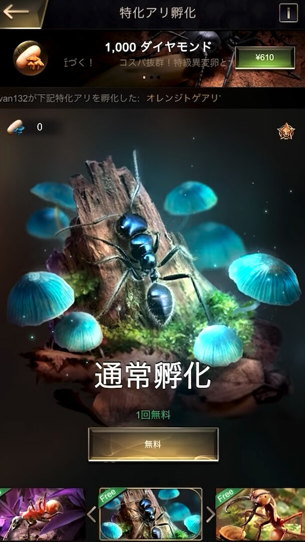 ガチャからは特化アリとアイテムが排出されます。また排出率がそれぞれ異なるガチャが3つありまして特級孵化、高級孵化、通常孵化があり1日に無料で引ける回数や確定で排出されるなども違います。無料ガチャは忘れずに引きましょう!それぞれのガチャの排出率をまとめて見ました!